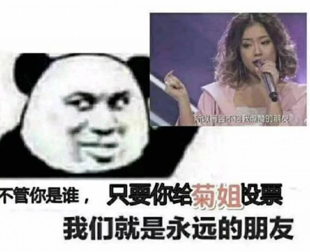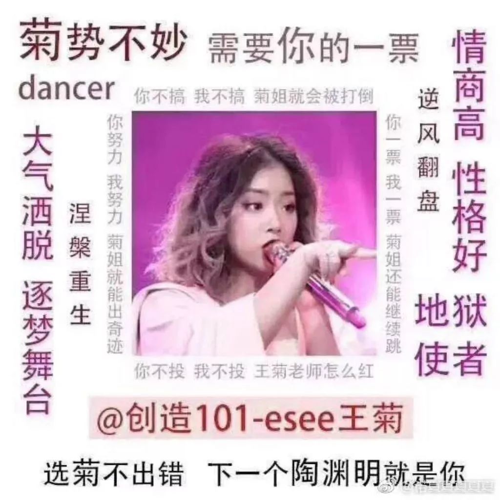 这个突然发酵的话题来自综艺节目《创造 101》,其火热程度不必多说,虽然还不能用「全民观看」来形容,但每周六播出之后都能在网络上引起热烈讨论,霸名热搜榜前几条。而在第 6 期播出后,「给菊姐投票」的相关信息突然爆发,铺天盖地都是相关的表情包、专属术语和拉票宣传语。