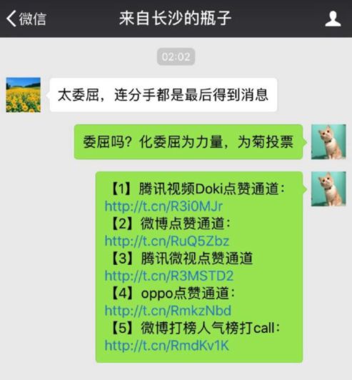 早期粉丝群的二十多位活跃者,常在群里讨论新奇的应援方式,比如用微信漂流瓶向陌生人拉票,发表情包、“菊话宝典”(这菊稳了、菊高临下、菊势大好)、打油诗。“‘土’是成本很低的一种可以给你带来有趣的东西,但是传播方式又很厉害。”涛涛说。