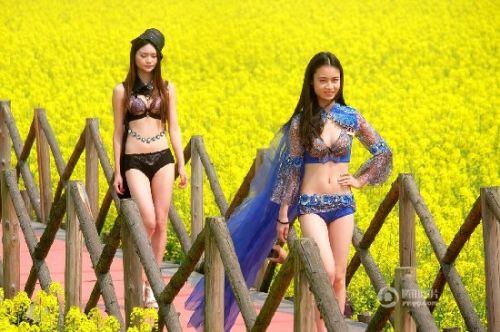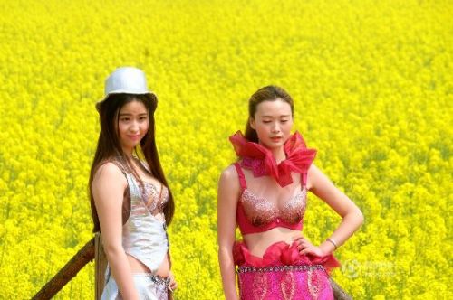 2016年3月19日,湖南常德一片油菜花海里,15位模特上演性感“内衣秀”,让游客大饱眼福。各种清凉装扮的模特在黄澄澄的油菜花海中走秀。