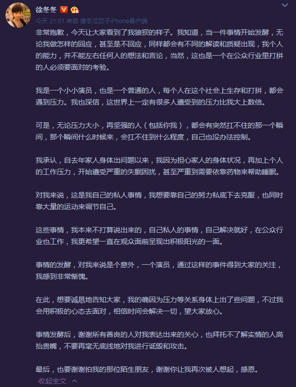 4月27日晚,徐冬冬发表长微博回应近日医院门口痛哭一事。微博中首先对自己的失态表示歉意,写道:“非常抱歉,今天让大家看到了我狼狈的样子。我知道,当一件事情开始发酵,无论我做怎样的回应,甚至是不回应,同样都会有不同的解读和质疑出现,我个人的能力,并不能左右任何人的想法和言论,当然,这也是一个在公众行业里打拼的人必须要面对的考验。”随即称因为从去年开始,家人的身体出现了问题,一方面担心家人的身体,另一方面自己的工作压力,所以遭受严重的失眠困扰,甚至严重到需要依靠药物来帮助睡眠。当然也积极锻炼靠大量的运动来调节自己。本来是不准备说出来的,作为一名公众人物,更希望一直在观众面前呈现出积极阳光的一面。