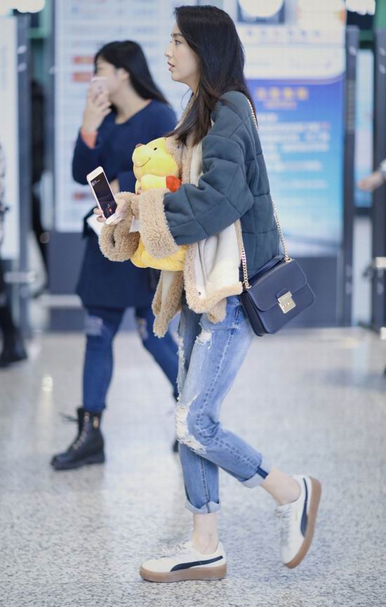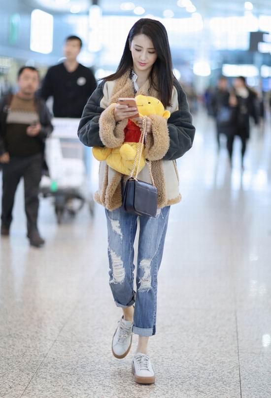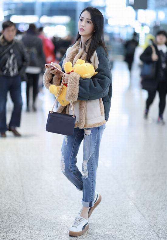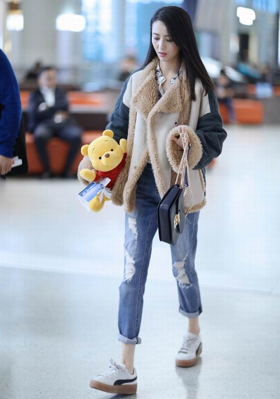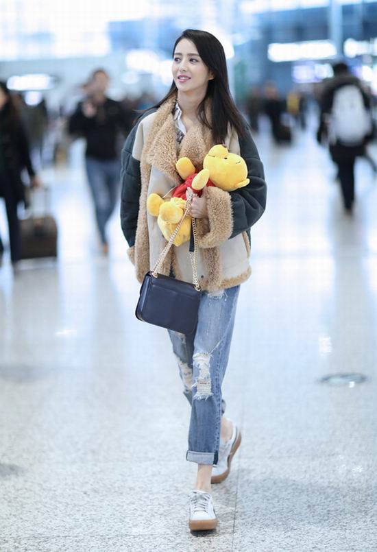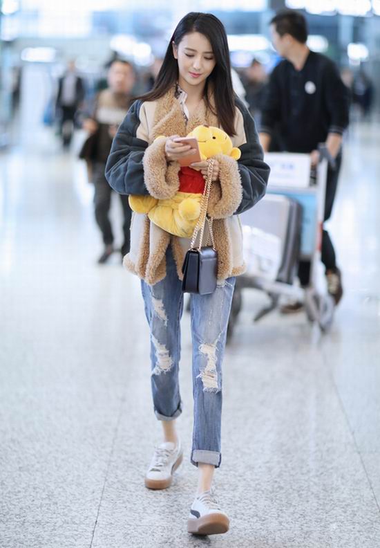 近日,佟丽娅一身休闲装扮出现在机场,盈盈浅笑让精致脸庞显得美丽十足,长发飘扬让女神感呼之欲出,手中紧抱粉丝送出的“萌熊”尽显可爱少女心。厚实的翻羊皮外套保暖又时尚,破洞牛仔完美修饰细长腿型,深蓝色的手袋与整体造型相得益彰,让撞色玩出新的“色系匹配度”,跨季度混搭风则为时尚气质加分不少。从这身搭配中不难看出,佟丽娅在追求时尚的同时也不忘保暖实用的穿衣原则。