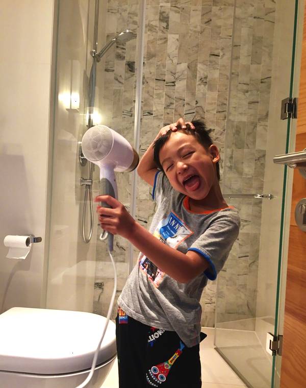 小亮仔不仅能够自己吹头发,同时还能摆出各种表情包,大概是觉得自己的头发被吹起来的时候特别帅吧!